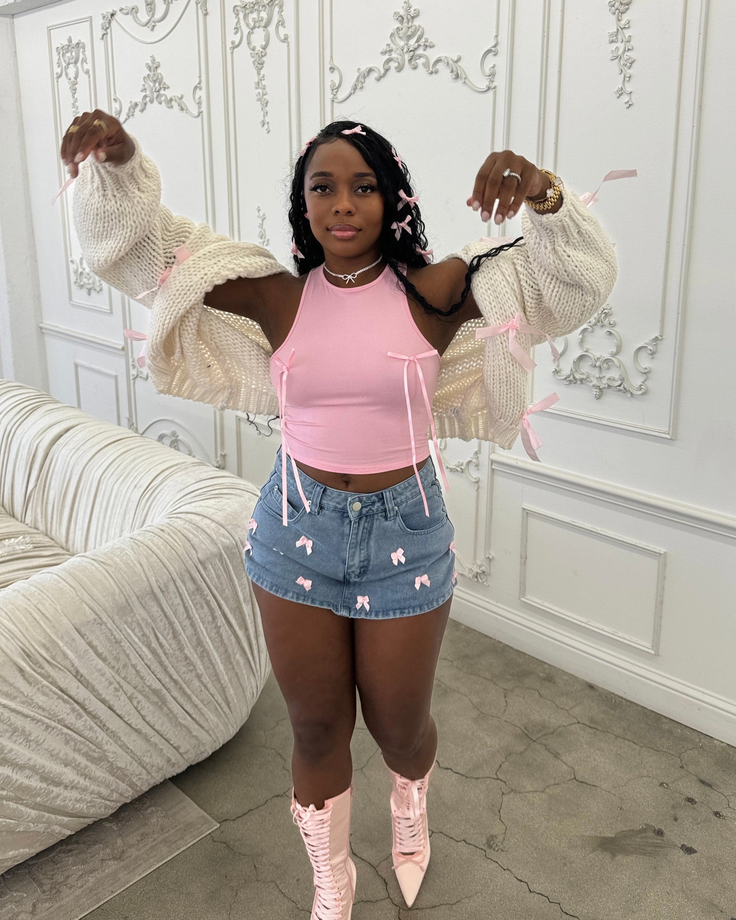 Denim Skort w/ Pink satin Blow Details