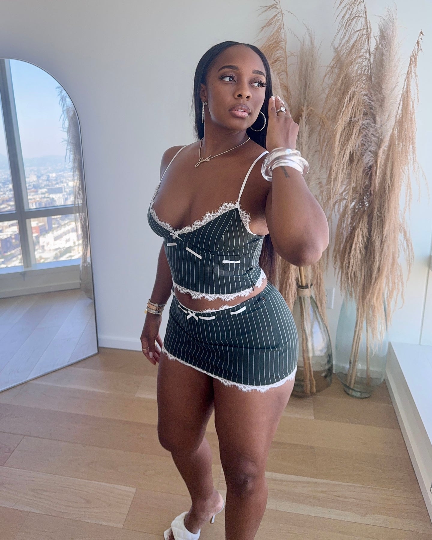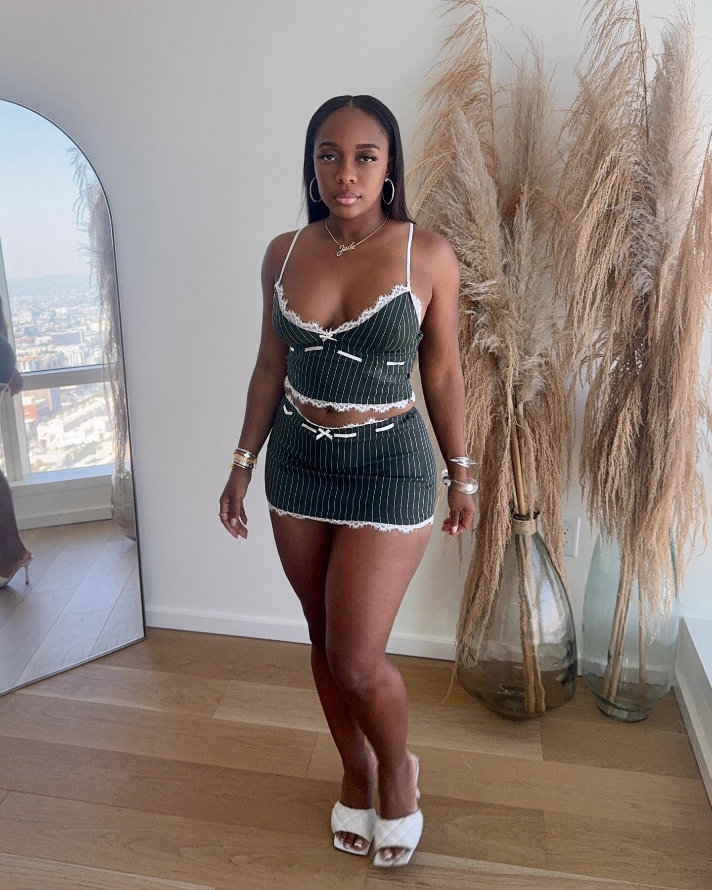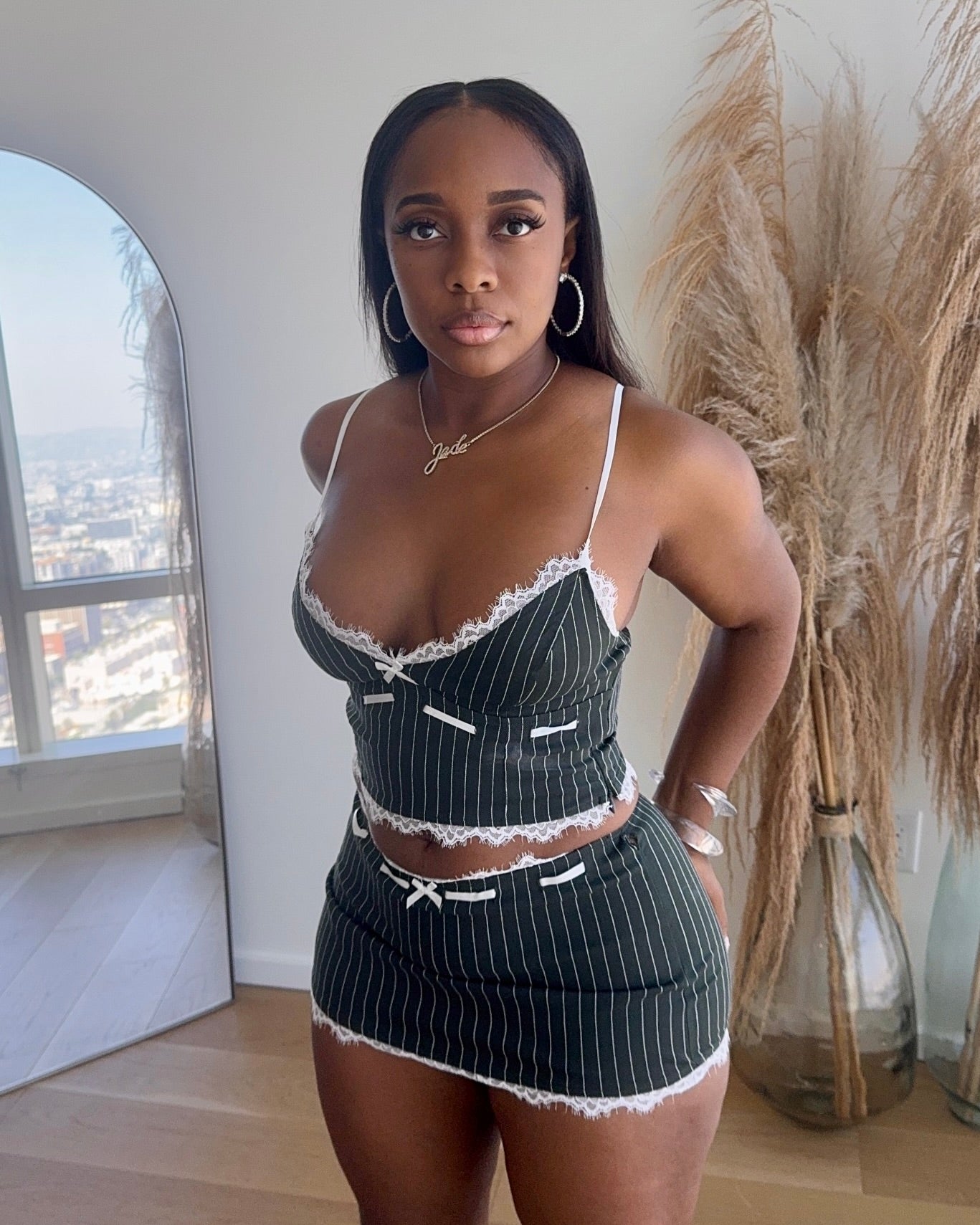 Pinstripe two-piece mini set with delicate lace trim