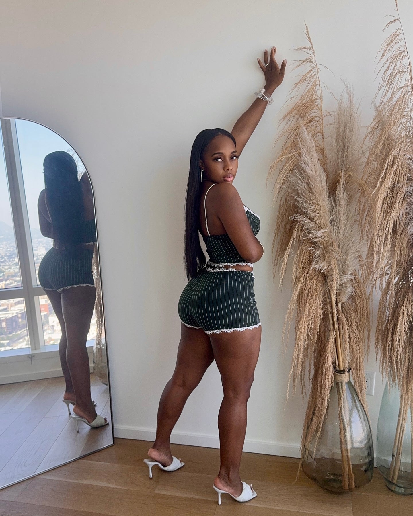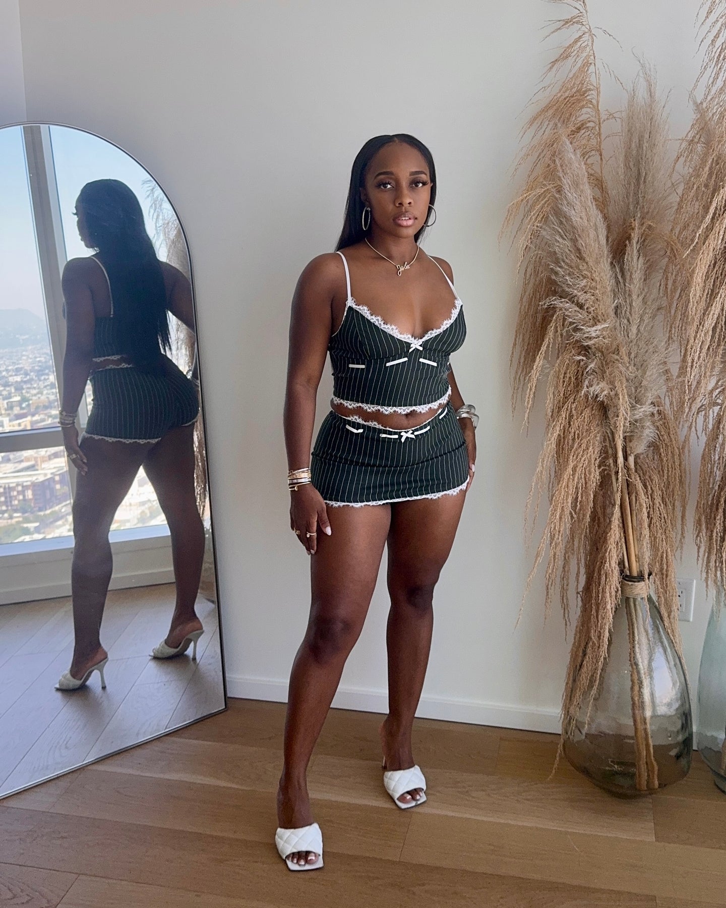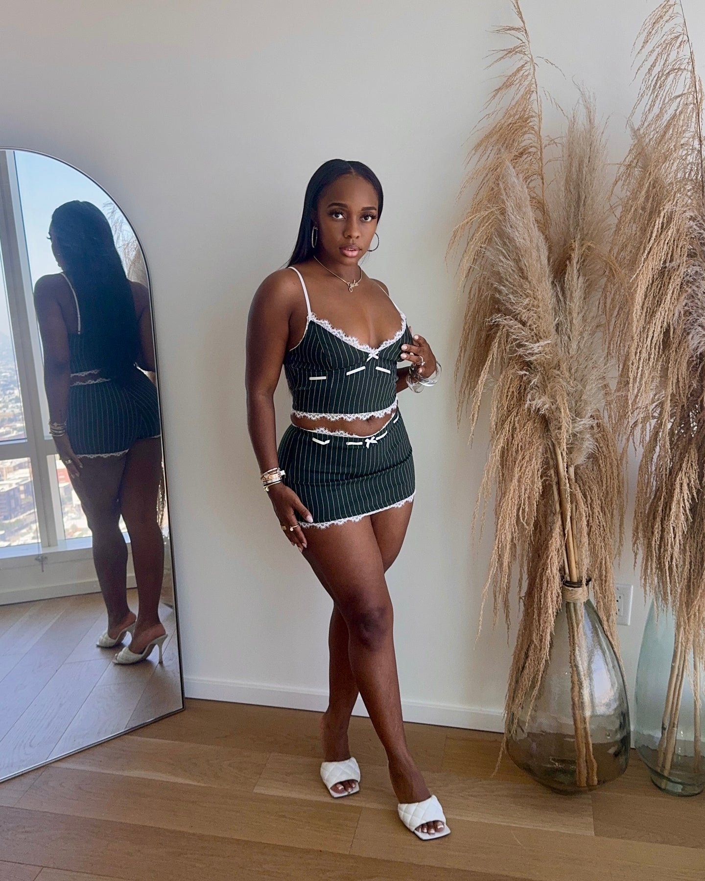 Pinstripe two-piece mini set with delicate lace trim